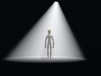 This theatrical lighting rig is a variation on a single spot light directly overhead. The light has been moved slightly to one side and angled so it shines on the figure including both the top of their head and the bottom of their feet.